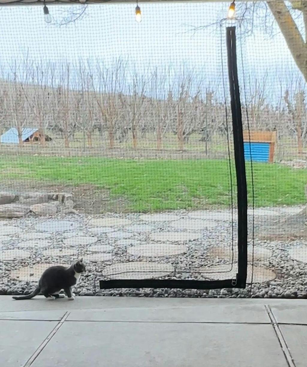 I attached the unit to my house and cut an access hole in the netting so the cats can access the enclosure freely and without risk of escape.
